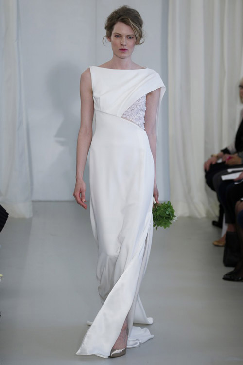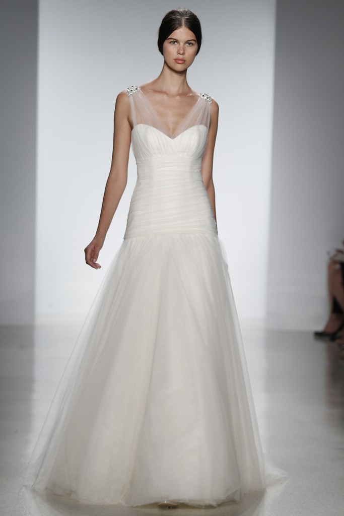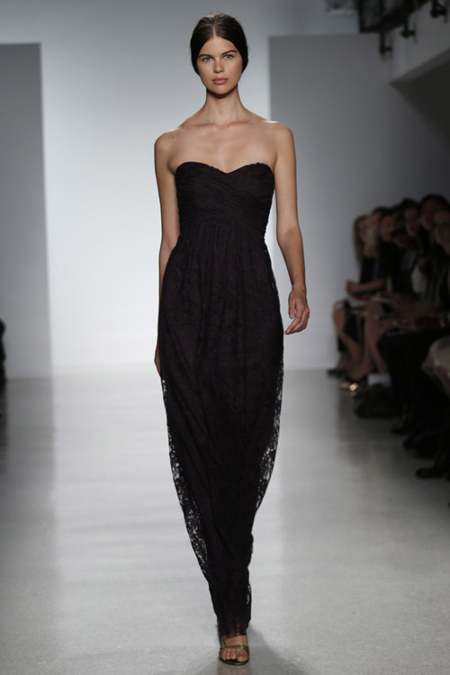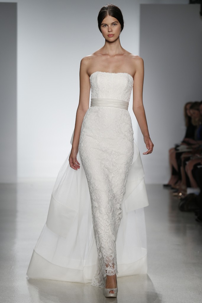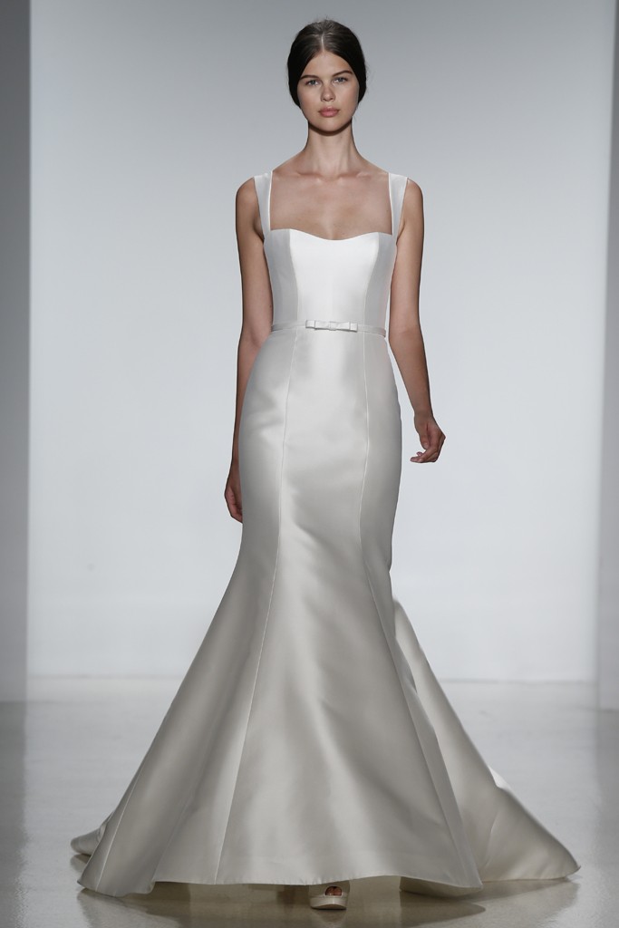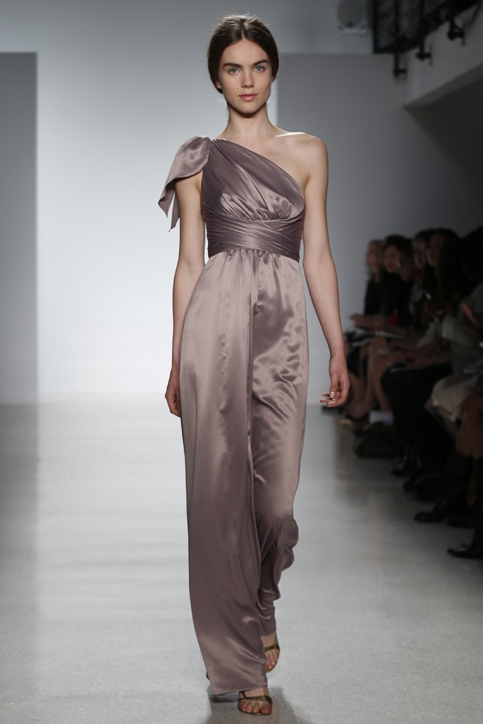 Amsale представила в своей коллекции лаконичность и четкость силуэтов. Блестящий шелк и матовость кружева, классический белый перекликается с пепельно-розовым и черным