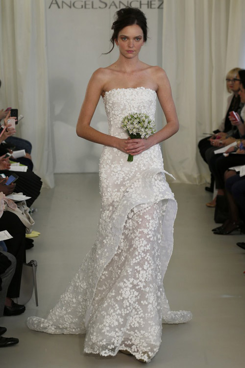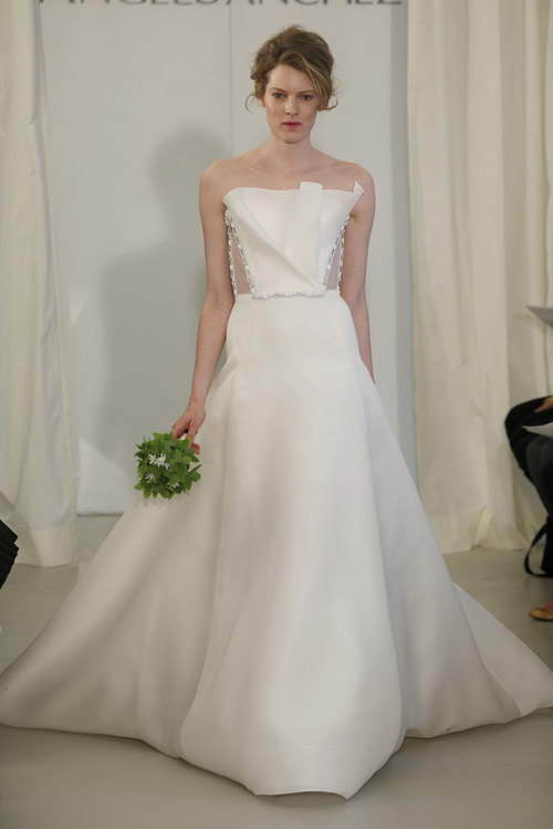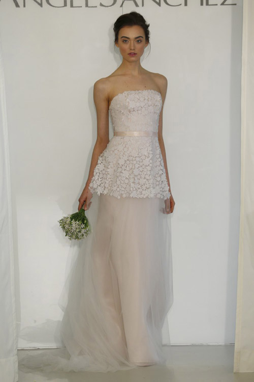 У Angel Sanchez в силуэтах присутствует некоторая геометричность за счет кружевных вставок в корсеты. Ажурные детали и изящные корсеты подчеркивают женственность образов.