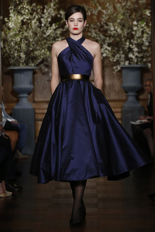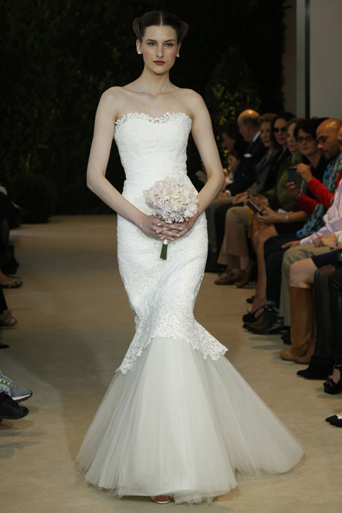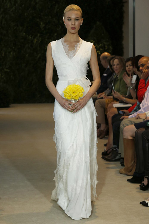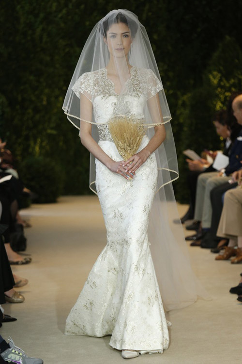 Для своей коллекции Carolina Herrera использовала кружево необычным образом. Она показала серию платьев с ручной росписью по кружеву, а так же платья в несколько металлизированном варианте декорированные серебряным бисером.