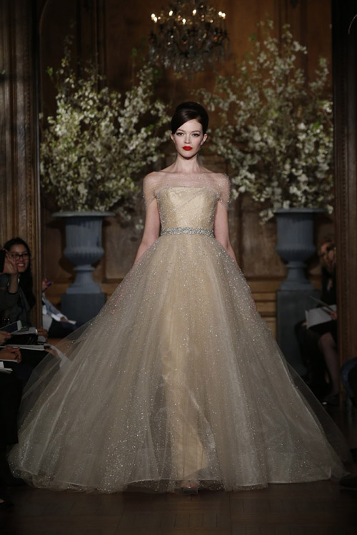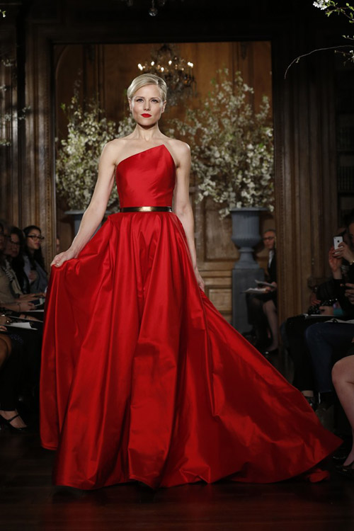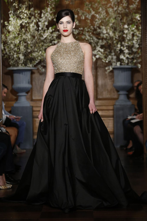 Romona Keveza сделала акцент на цвете от нюдового до темно-синего, малахитового , золотого и красного. Шелковая тафта и органза, открытые плечи, бальные платья расшитые кристальным бисером.