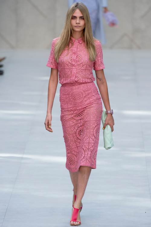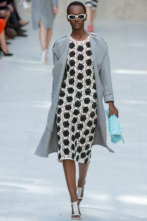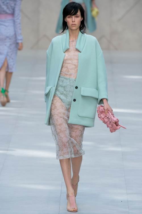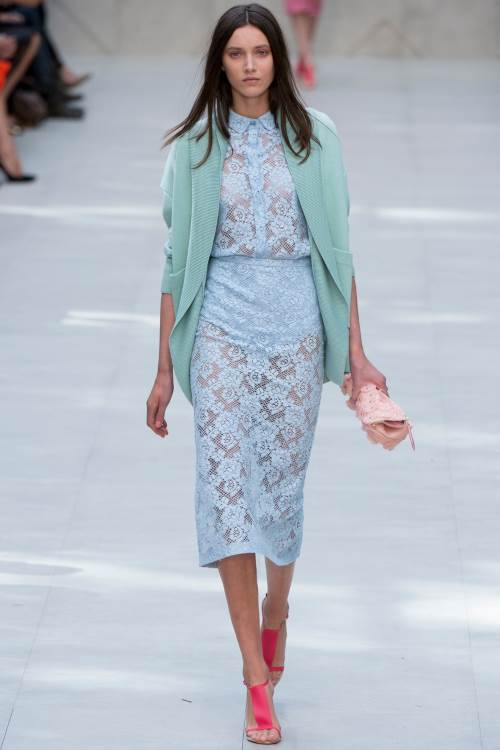 | Бренд Burberry Prorsum продемонстрировал в своей коллекции весна -лето 2014 в Лондоне прозрачность кружева ,пастельные цвета и ставший уже трендом «гороховый» принт. Burberry одели своих моделей в прозрачные юбки в сочетании с теплыми кардиганами и пальто. В целом коллекция получилась очень элегантной.
