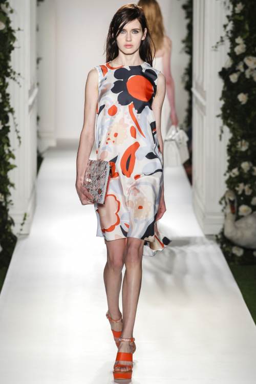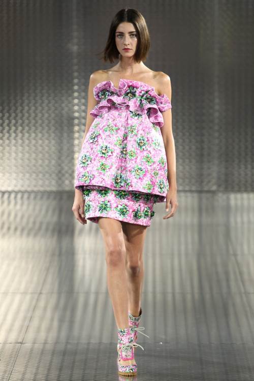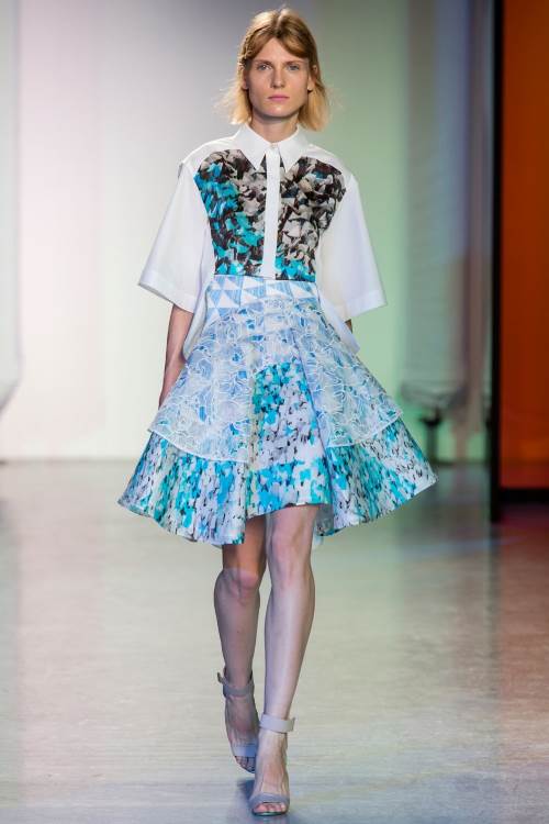 Mary Katrantzou в своей коллекции весна – лето 2014 в Лондоне то же не обошла принт в своих образах. Особенно милы девичьи платья в стиле беби-долл с талией под грудью, обрамленные рюшами и украшенные цветочным принтом.