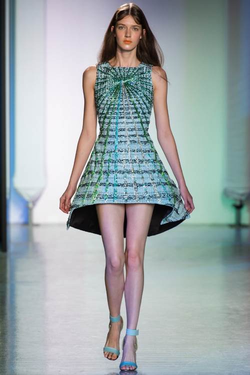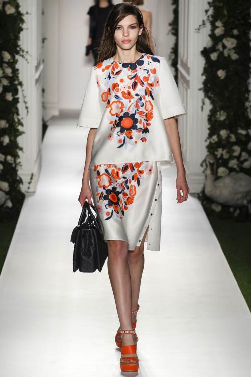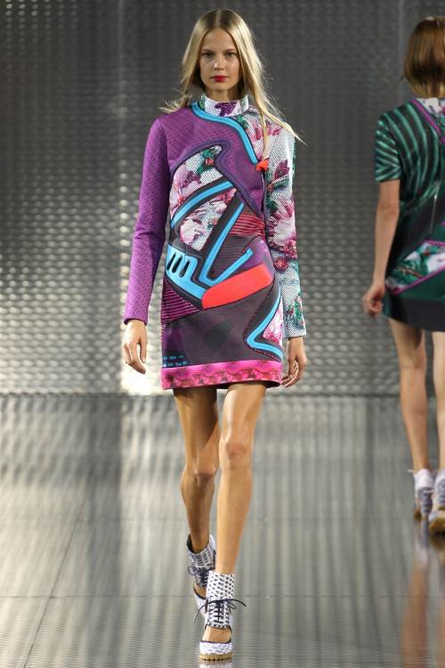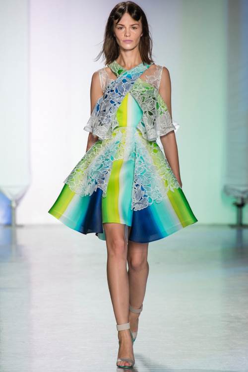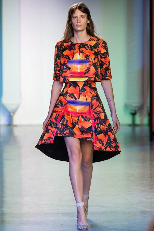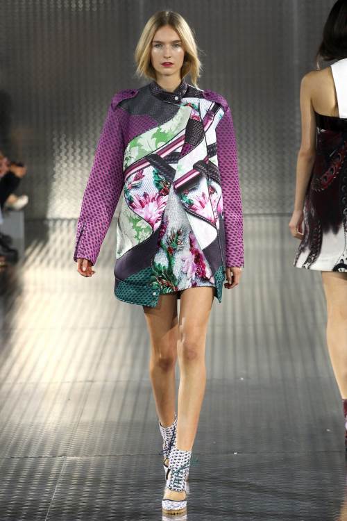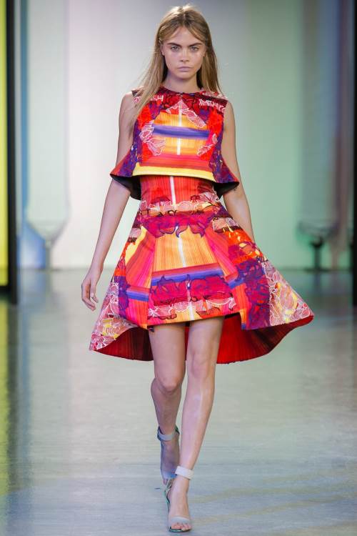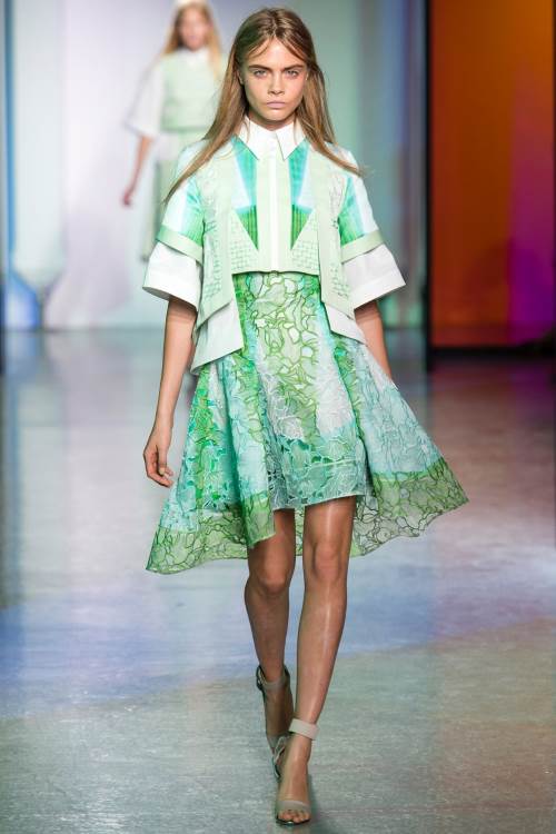 По весеннему нежная и жизнерадостная коллекция получилась у Peter Pilotto показанная на Лондонской неделе моды весна – лето 2014. В образах присутствуют уже ставшие трендом широкие блузы и расклешенные к низу юбки. Нежно – зеленная расцветка переплетается с ярко розовым, почти неоновым цветом.