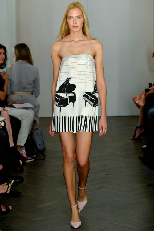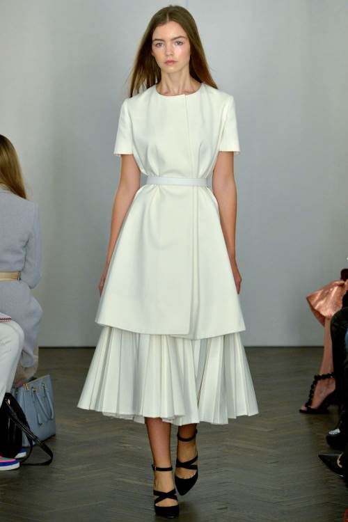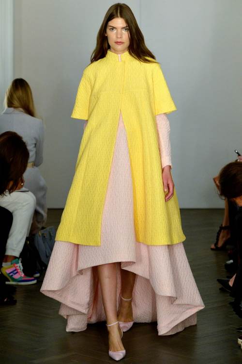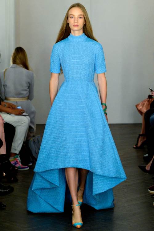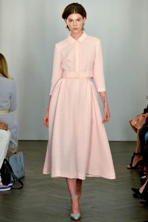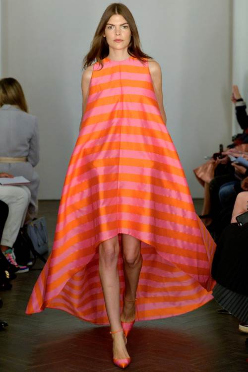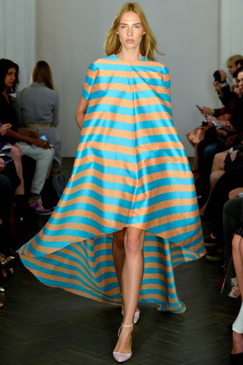 Необыкновенно женственную и нежную коллекцию показала Emilia Wickstead на Лондонской неделе моды весна-лето 2014. Широкие юбки,приталенные платья и яркие цвета, дополненные принтом в полоску.