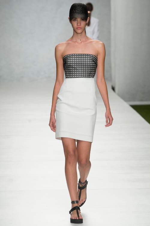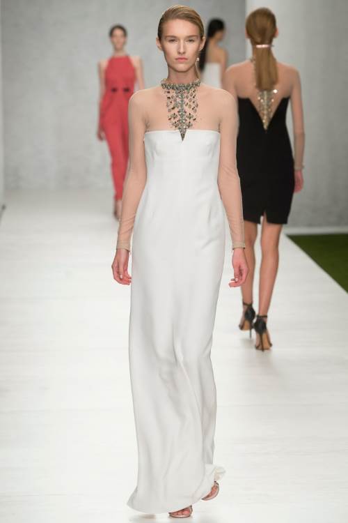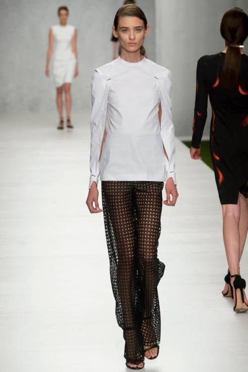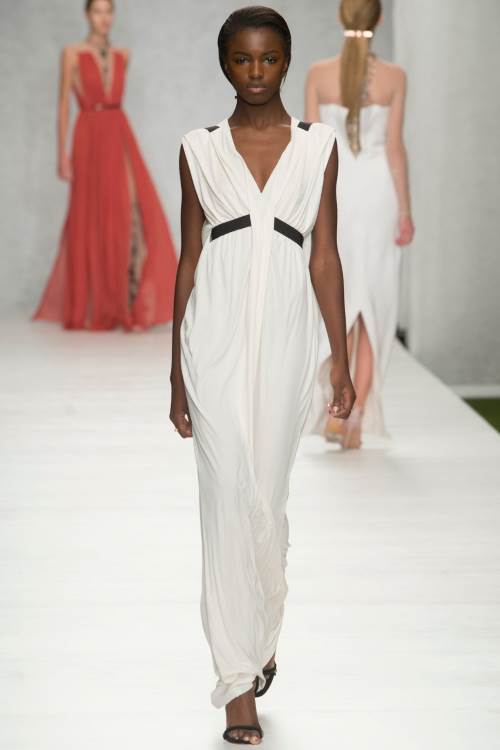 Marios Schwab представил на Лондонской неделе моды весна-лето 2014 классические силуэты дополненные яркими принтами, декорированные сеткой и металлическими элементами. Особенно хороши вечерние платья, от коротких и прозрачных до длинных, в греческом стиле, элегантно-простых.