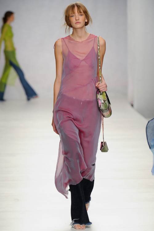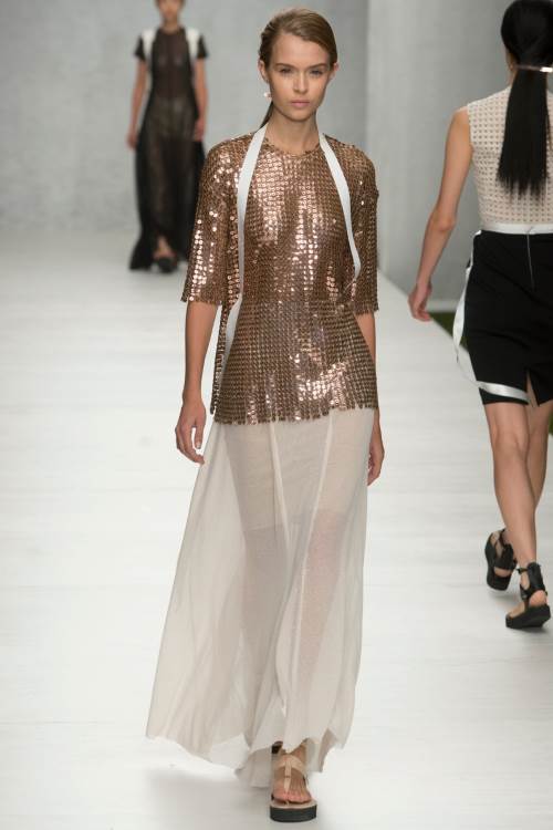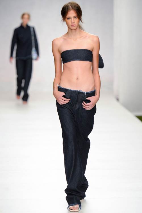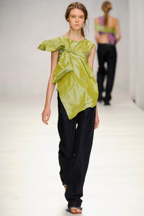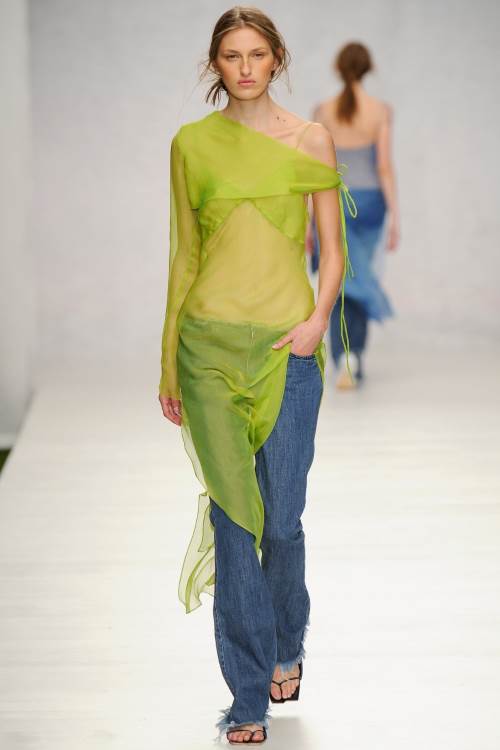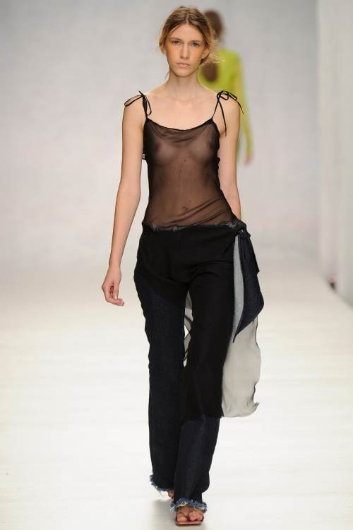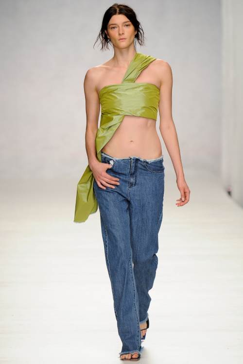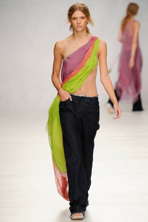 Marques" Almeida на Лондонском показе весна- лето 2014 представили лаконичную, в тоже самое время яркую коллекцию. Мешковатая джинса, в сочетании с разнообразными топами, от совсем крохотных, прикрывающих едва грудь, до ярких, в индийском стиле, завязанных на одном плече и ниспадающих к низу, подобно сари, из полностью прозрачной ткани.