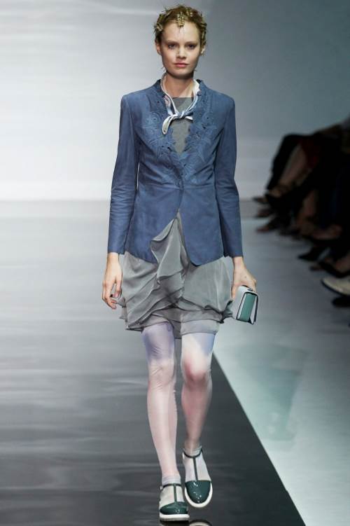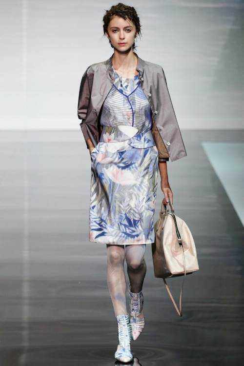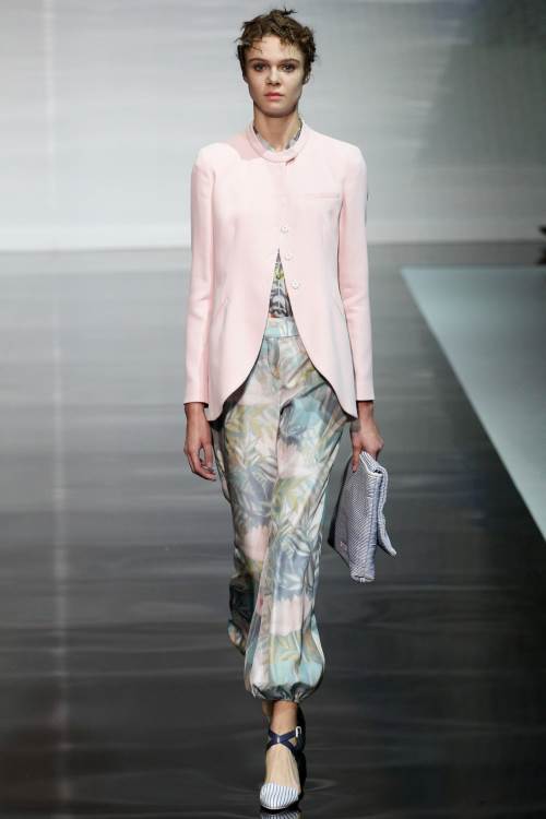 Emporio Armani на Миланской неделе моды весна-лета 2014 показал классические образы, сделав акцент на ткани. Струящийся, переливающий шелк, четкие линии и легкость силуэта.