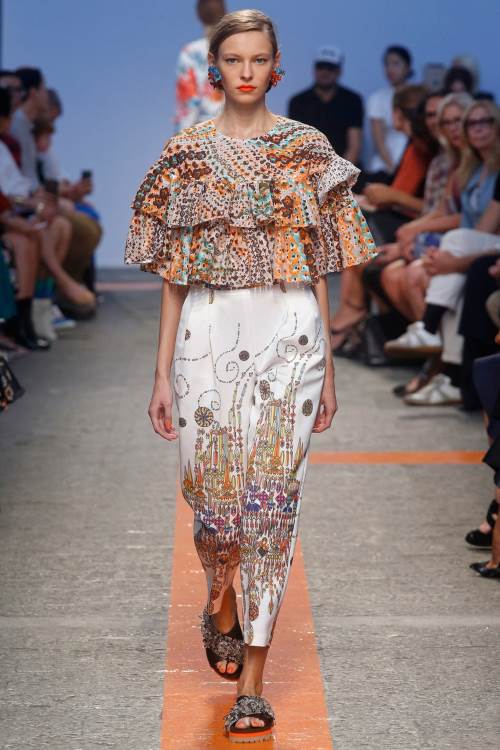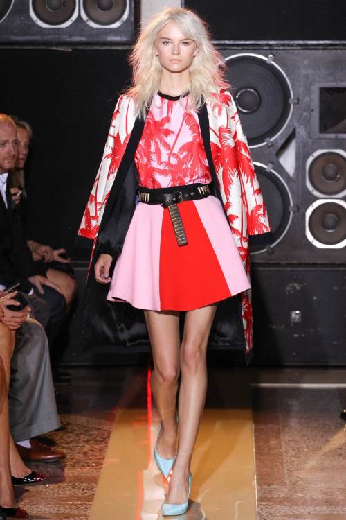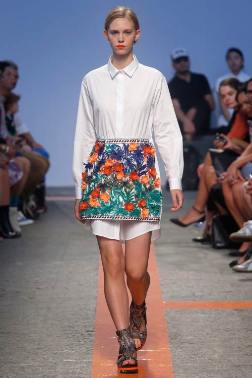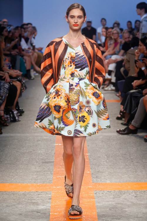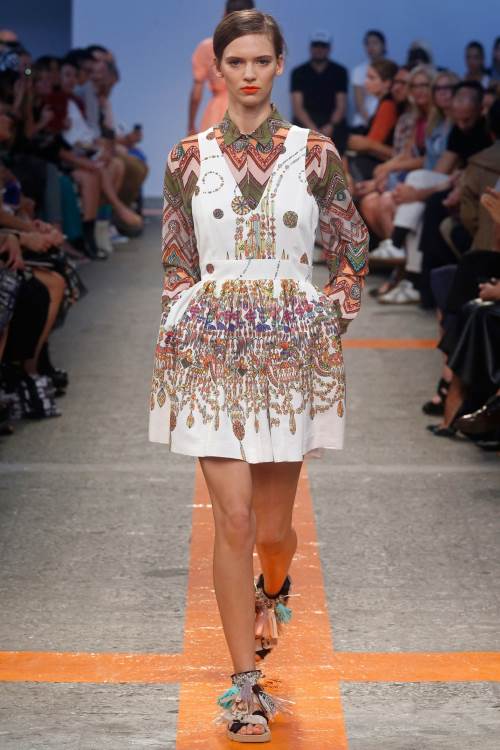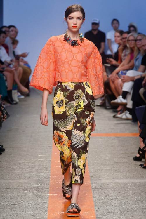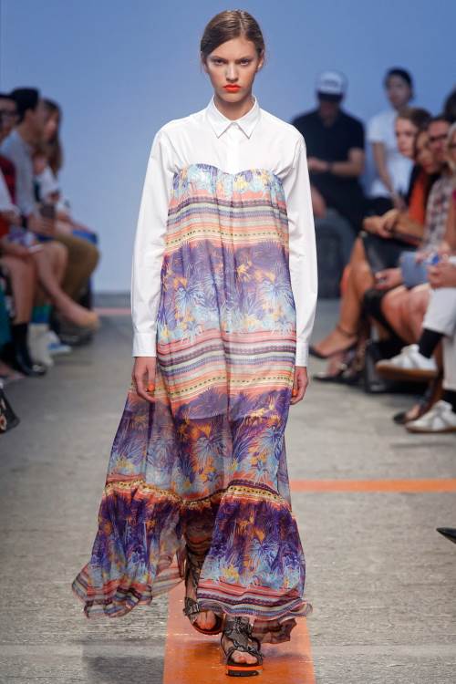 Бренд MSGM представил яркую, даже пеструю коллекцию на Миланской модной неделе весна- лето 2014. Немыслимые сочетания цветов и принтов от геометричных до цветочных. Платья –фартуки, платья –сарафаны , широкие, затейливо расшитые блузы с воланами. Все это безумство красок и ткани очень впечатляет.