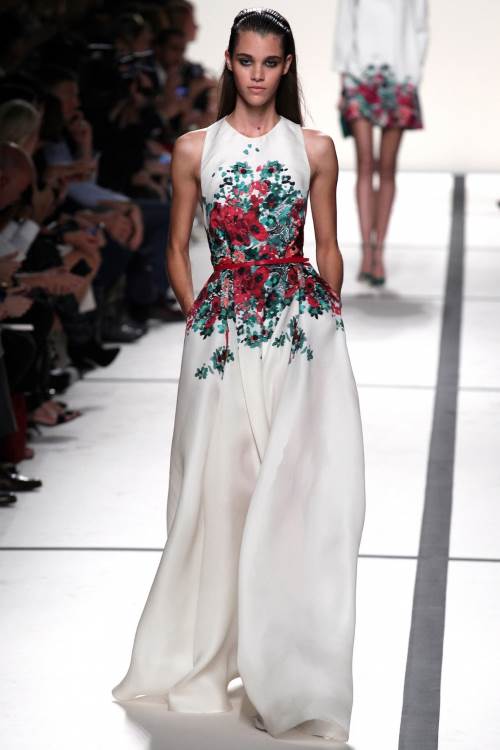 Волшебство женственности и изысканности, прозрачные ткани, украшенные кружевом, аппликациями или цветочным принтом, цвета от белоснежного до изумрудного и красного. Платья, как приталенные, так и свободно ниспадающие. Все это Elie Saab показал в своей коллекции весна - лето 2014 в Париже.