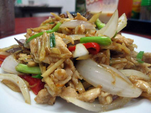 Курица, обжаренная в пасте красного карри, затем политая кокосовым кремом, делающим карри сочным, пряным и ароматным. Блюдо подается с мелко нарезанными листьями лимонника. Если блюдо приготовлено правильно, то динамический (или демонический?) острый вкус чувствуется с первого прикосновения. Лимонник очень освежает блюдо. В этом тайском блюде, так же сочетаются все тайские вкусы. Одно из топовых блюд.