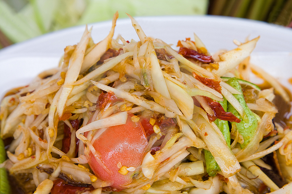 Сом Там, известный в Тайланде салат. Основа Сом Тама — это овощи: зеленая папайя (в Таиланде это овощ), помидоры и длинная стручковая фасоль. По большому счету, овощной состав может быть практически каким угодно — вместо папайи сгодится зеленый манго, огурец или белокочанная капуста, морковка тоже будет не лишняя, а иногда Сом Там и вовсе делают из фруктов. Чеснок и перчик чили сначала измельчаются в ступке. Сок тамаринда, рыбный соус, арахис, сушеные креветки, помидоры, сок лайма, паста из сахарного тростника, фасоль и горсть зеленой папайи следуют в ступку. Сладкий, соленый и пряные ароматы в сочетании с зеленой хрустящей папайей.