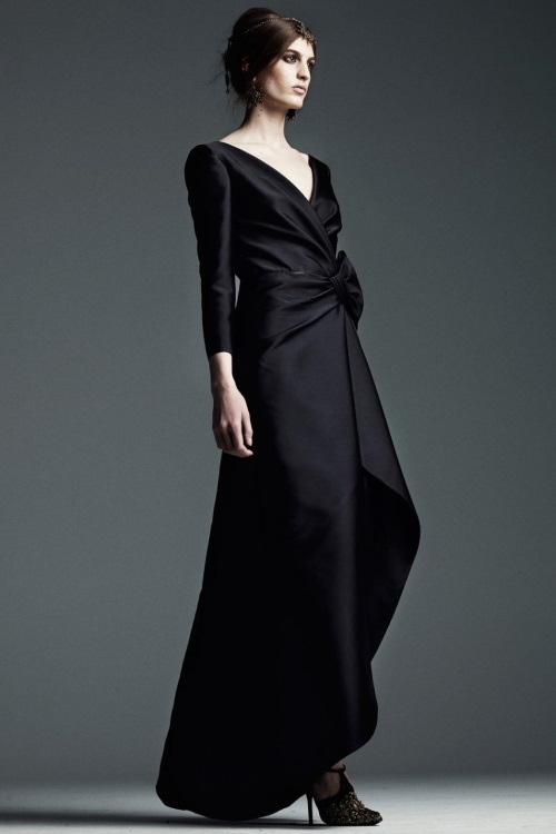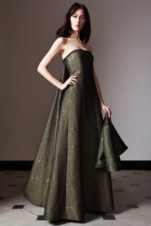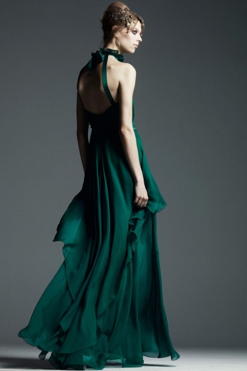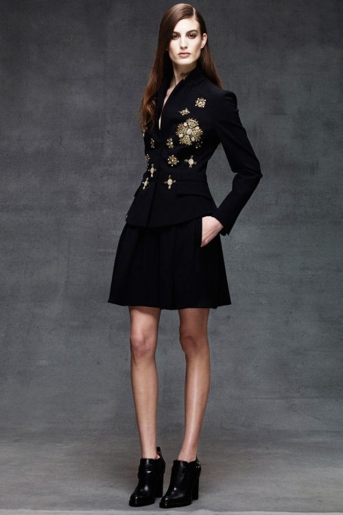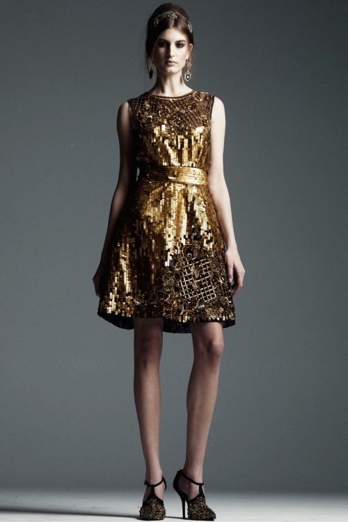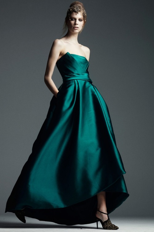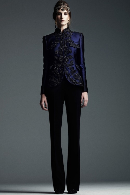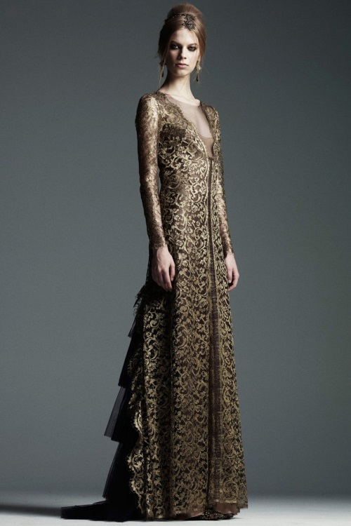 Богато декорированные костюмы и платья с золотой вышивкой, имитирующей военные награды и знаки, глубокий синий, изумрудный, золотой и черные цвета, роскошь парчи и шелка, струящийся шифон представила Alberta Ferretti в коллекции Осень-Зима 2014-2015/Pre-Fall.
