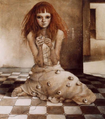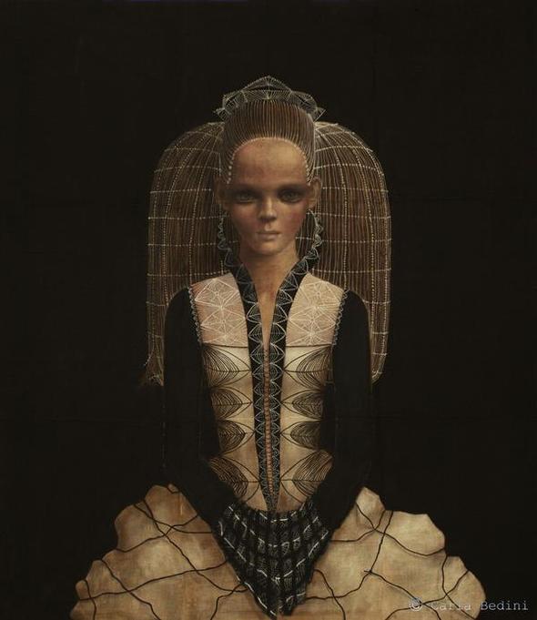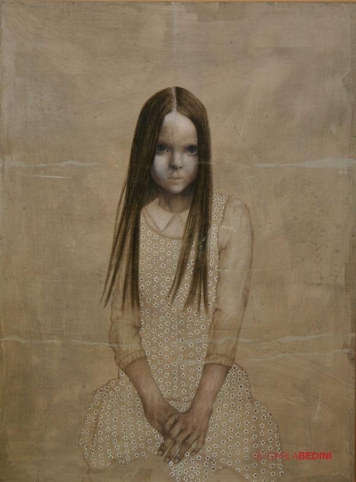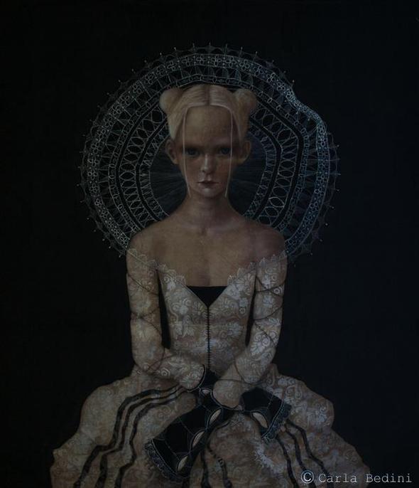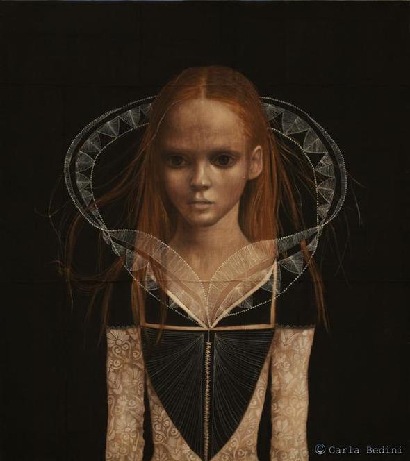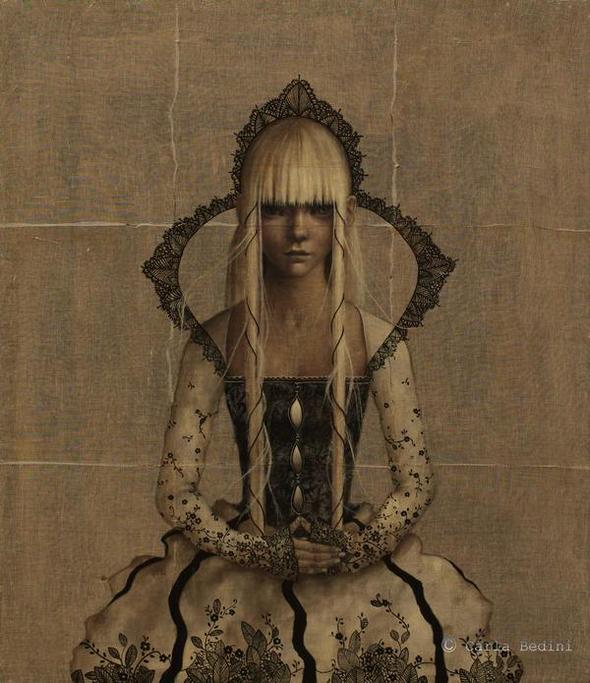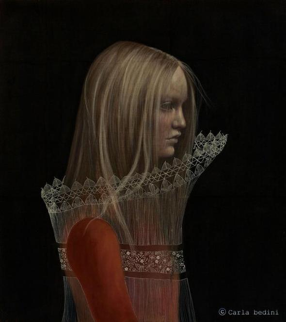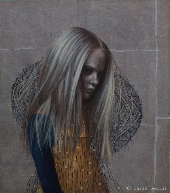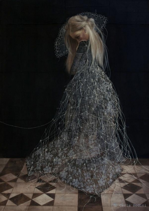 Итальянка Карла Бедини ( Carla Bedini) прославилась своей живописью в стиле Фентези. Персонажи художницы так же хрупки ,как и материал ,который она использует для своих рисунков. Карла пишет свои картины на медицинской марле.